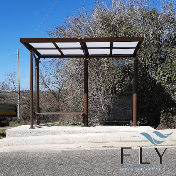 Nadstrešnica za autobusne stanice Pit Stop je konzolna nadstrešnica i podupiru je tri nosiva stupa za podupiranje stranica od čeličnog lima odgovarajućeg oblika. Stupovi u podnožju opremljeni su perforiranom prirubnicom za pričvršćivanje zaklona na tlo pomoću ekspanzijskih vijaka (nisu isporučeni). Kompaktni polikarbonatni krov podupiru ekstrudirana aluminijska rebra i proturebra s brtvenim brtvama koje se oslanjaju na cjevaste čelične poprečne elemente pričvršćene vijcima u odgovarajuće nosače sa strane. Stražnja stijenka izrađena je od laminiranih staklenih ploča pričvršćenih na stupove odgovarajućim držačima za staklo. Može se opremiti bočnom stijenkom, osvijetljenom bočnom oglasnom pločom s otvorivim vratima i klupom integriranom u strukturu. Svi metalni dijelovi su pocinčani prema UNI standardima i obojeni termoreaktivnim poliesterskim prahom. Vijci su od nehrđajućeg čelika.