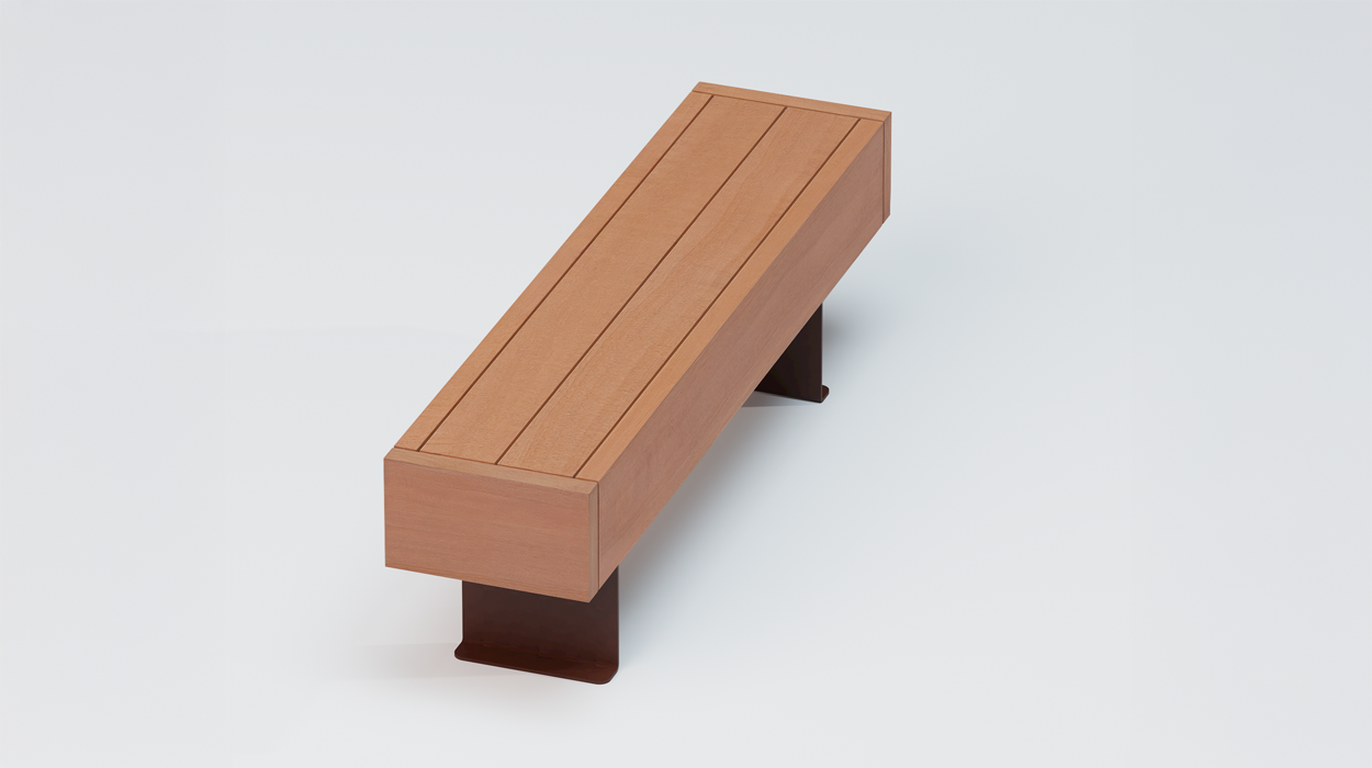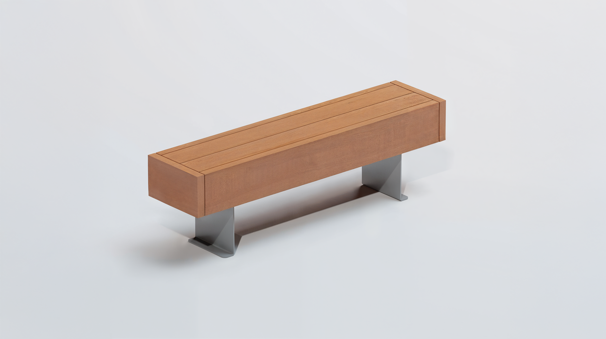 Klupa izrađena od metalnog okvira od pocinčanih čeličnih profila s bazom od pocinčanog lima. Sjedalo je prekriveno letvicama od finog okumè drva. Klupa je opremljena rupama za pričvršćivanje na tlo.