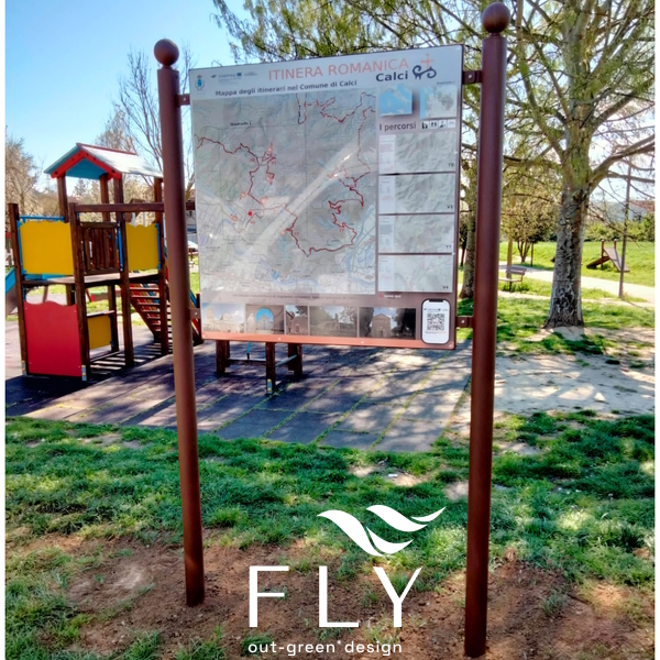 Vanjska oglasna ploča jednostrana Banner 100×100. Oglasna ploča sastavljena od dva 2 nosiva stupa od cjevastog čelika s ukrasnom glavom i kuglom od kovanog čelika i prirubnicom na dnu. Središnji okvir je izrađen od željezne cijevi četvrtastog presjeka na koju je zakovicama pričvršćen aluminijski lim koji služi kao podloga za postavljanje plakata. Zaslon ima dimenzije 1000×1000 mm. Svi metalni dijelovi su pocinčani i obojeni termoreaktivnim poliesterskim prahom. Vijci su od nehrđajućeg čelika. Oglasna ploča se isporučuje s nosačima za ugradnju i ukrasnim pločama za pokrivanje cementa i označavanje dijela koji se cementira.