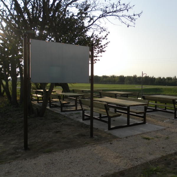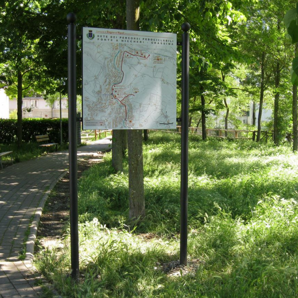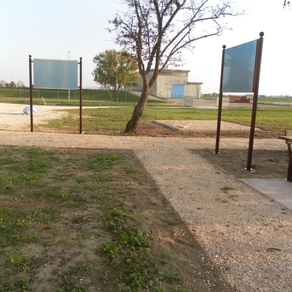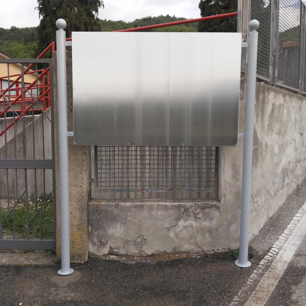 Vanjska oglasna ploča jednostrana Banner 150×100. Oglasna ploča sastavljena od dva 2 nosiva stupa od cjevastog čelika s ukrasnom glavom i kuglom od kovanog čelika i prirubnicom na dnu. Središnji okvir je izrađen od željezne cijevi četvrtastog presjeka na koju je zakovicama pričvršćen aluminijski lim koji služi kao podloga za postavljanje plakata. Zaslon ima dimenzije 1000×1000 mm. Svi metalni dijelovi su pocinčani i obojeni termoreaktivnim poliesterskim prahom. Vijci su od nehrđajućeg čelika. Oglasna ploča se isporučuje s nosačima za ugradnju i ukrasnim pločama za pokrivanje cementa i označavanje dijela koji se cementira.