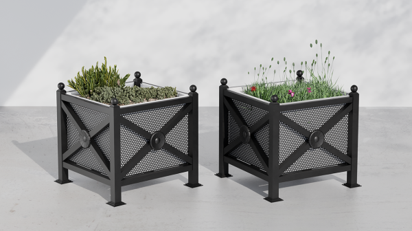 Kvadratna žardinjera izrađena od metala, savršena za urbani dekor. Idealna za dodavanje daška stila i prirode gradskim ulicama.