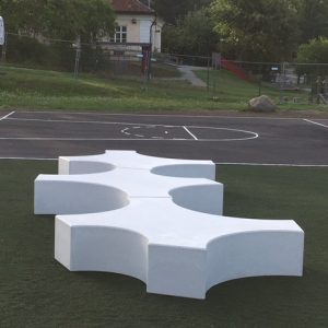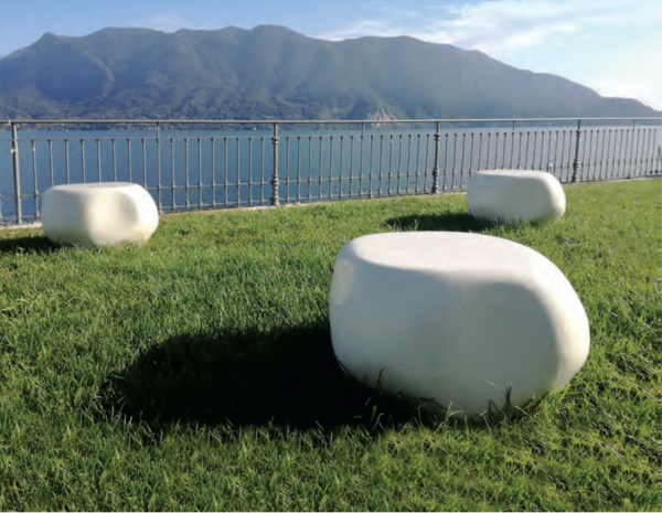 Tekući, prirodni oblici monolitnih klupa, dostupnih u različitim veličinama, sa ili bez drvenog sjedala.