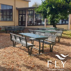 Prikladan set elegantnog i modernog dizajna koji se sastoji od stola i dvije klupe sa ili bez naslona. Nosiva konstrukcija od čeličnih cijevi pocinčanih i bojanih u raznim RAL bojama. Bazne ploče su zavarene u donjem dijelu kako bi se garnitura mogla pričvrstiti na tlo ekspanzionim vijcima. U gornjem dijelu su zavarene ploče na koje će se učvrstiti drvene letvice. Sjedalo i ploča stola izrađeni su od letvica od nordijskog bora impregniranog autoklavom ili od finog drva. Kako bi sjedalo bilo stabilno, u sredini je pričvršćeno pojačanje vijcima. Vijci od nehrđajućeg čelika.
