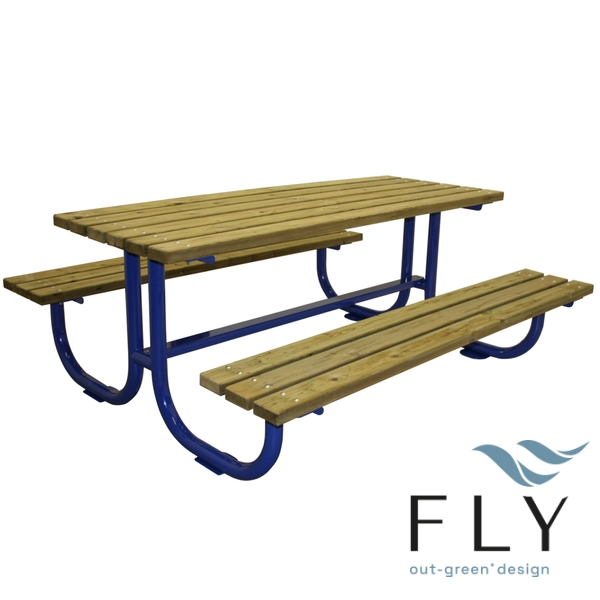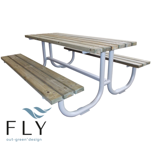 Sjedalo i ploča stola izrađeni su od drvenih letvica od nordijskog bora tretiranog konzervansom u autoklavu ili od finog drva. Stol je s jedne strane duži od sjedala kako bi ga mogli koristiti osobe u invalidskim kolicima.