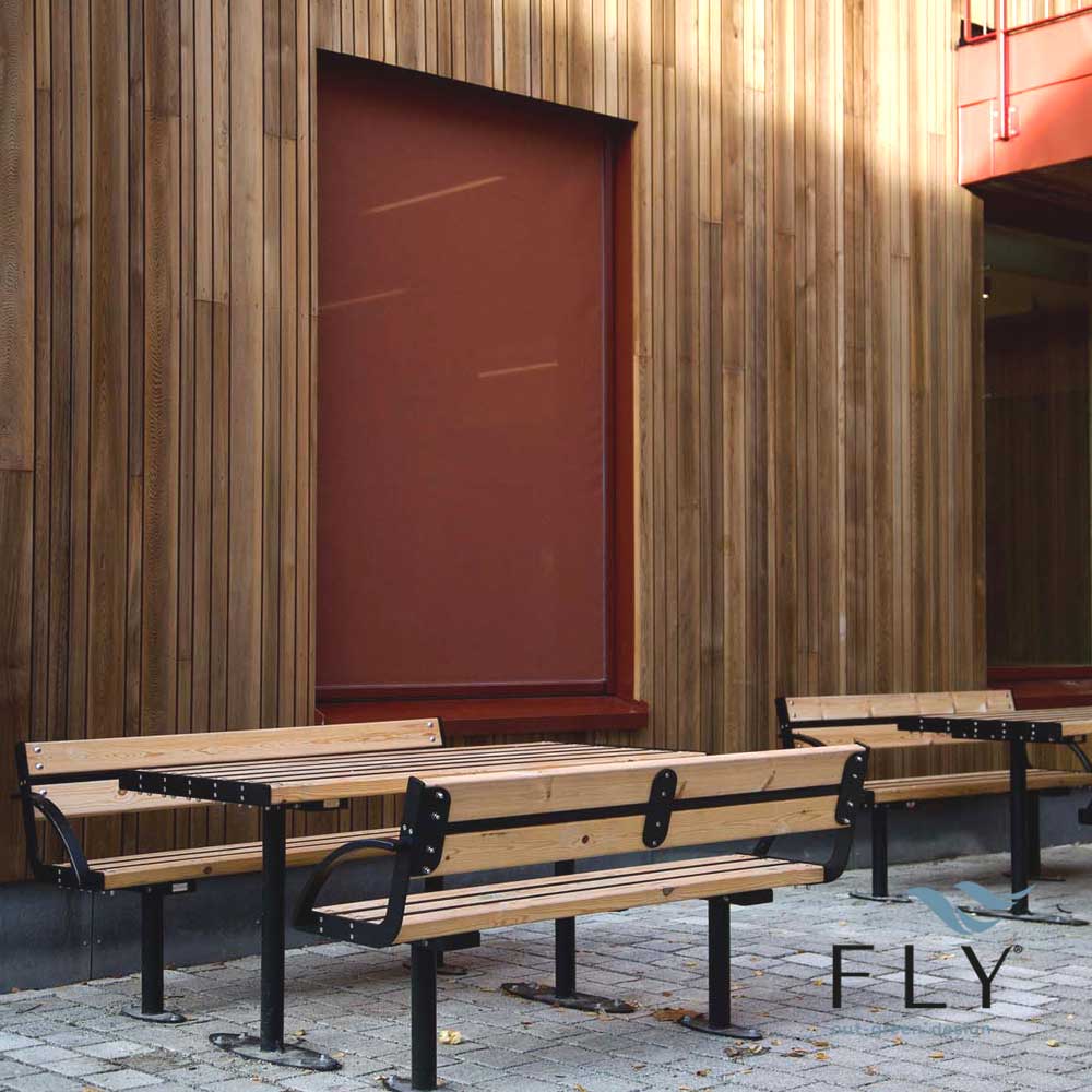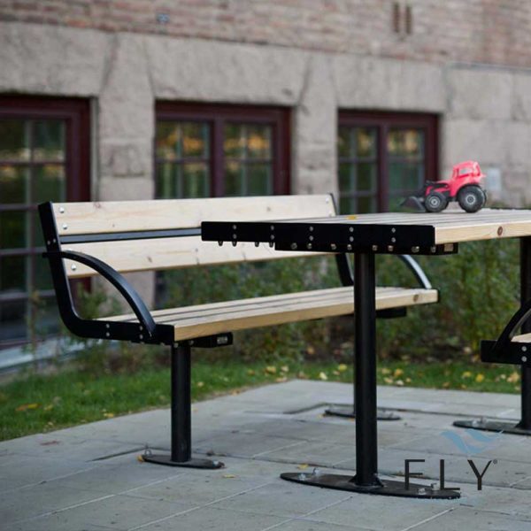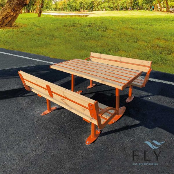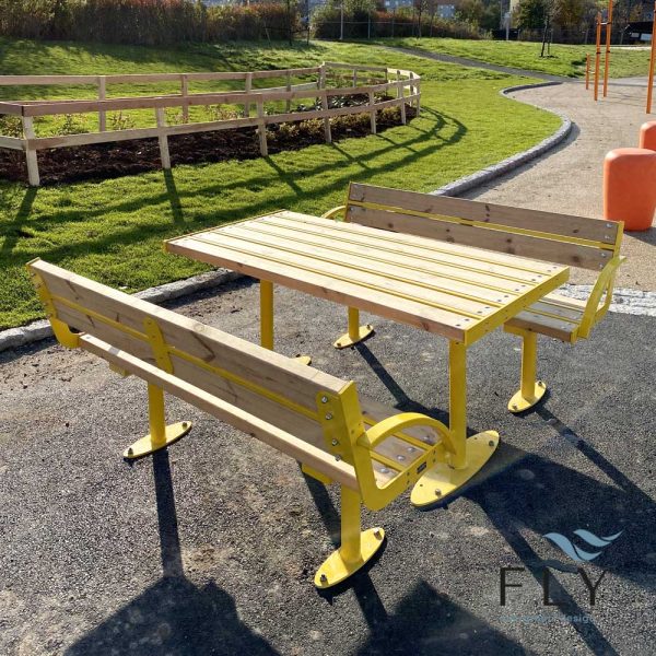 Set koji se sastoji od stola i dvije klupe s naslonima jednostavnih linija, pogodan za škole, parkove i kampiranje. Nosiva konstrukcija od čeličnih cijevi pocinčanih i bojanih u raznim RAL bojama. Bazne ploče su zavarene u donjem dijelu kako bi se garnitura mogla pričvrstiti na tlo ekspanzionim vijcima. U gornjem dijelu su zavarene ploče na koje će se učvrstiti drvene letvice. Sjedalo i ploča stola izrađeni su od letvica borovine impregnirane u autoklavu ili u fino drvo. Kako bi sjedalo bilo stabilno, u sredini je pričvršćeno pojačanje vijcima. Vijci od nehrđajućeg čelika.