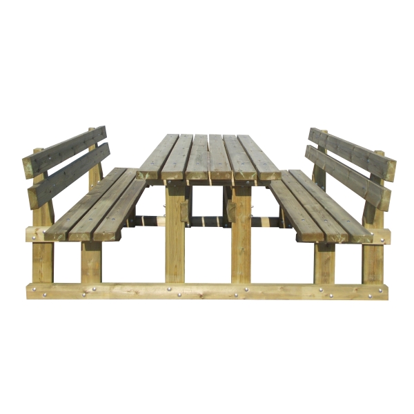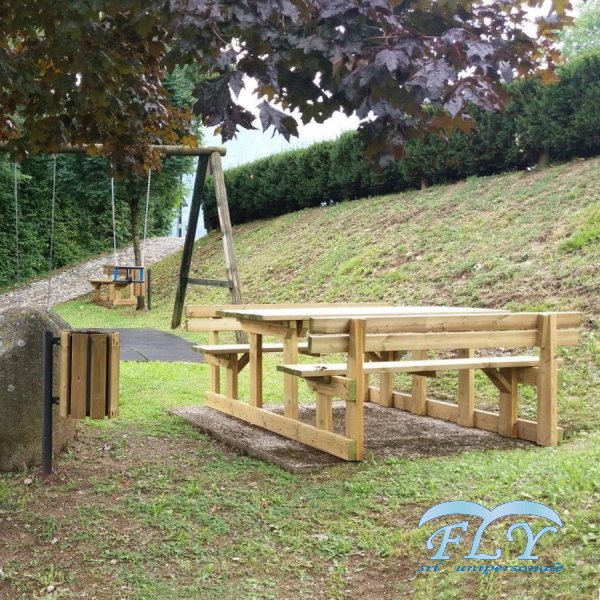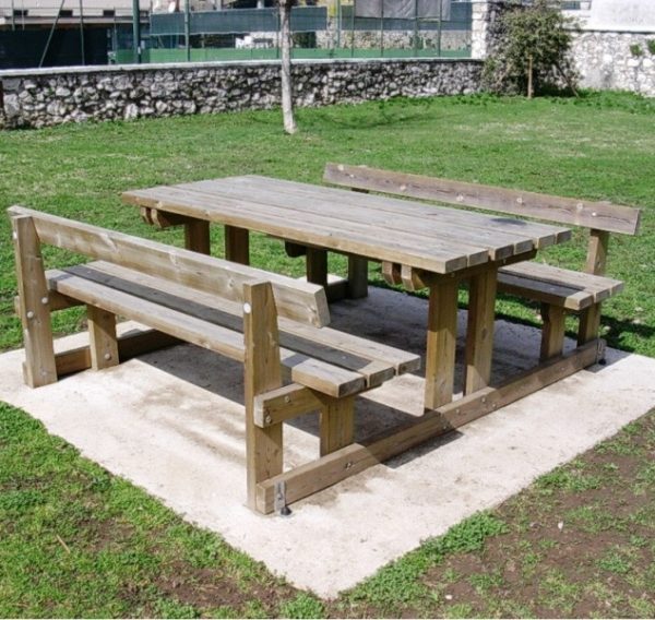 Drveni set Madrier. Stol i 2 klupe sa naslonom, vrlo udobne i robusne. Izrađene od borovine impregnirane solima u autoklavu prema normi DIN 68800. Nosiva konstrukcija klupa i stola izrađena je od blanjanih dasaka sa zaobljenim rubovima. Ploča stola, ploča sjedala i nasloni izrađeni su od razmaknutih dasaka, blanjanih i zaobljenih rubova. Montaža je izvedena s prolaznim vijcima i samosigurnim maticama. Povremenom provjerom napetosti učvršćenja moguće je vratiti savršenu stabilnost strukture čak i nakon godina korištenja. Isporučuje se djelomično unaprijed sastavljen. Često se koristi u planinskim područjima na biciklističkim/pješačkim stazama, ne boji se snijega i leda, a zbog vrste korištenih materijala ima dug vijek trajanja bez održavanja.