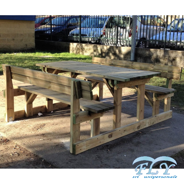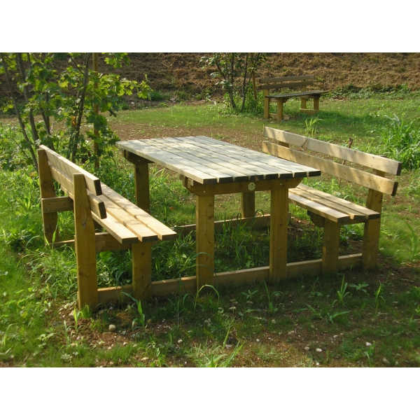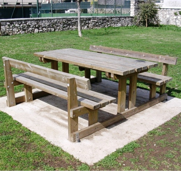 Madrier set koji se sastoji od stola i dvije klupe sa ili bez naslona, vrlo udoban i čvrst. Izrađena od borovine impregnirane solima u autoklavu prema normi DIN 68800. Nosiva konstrukcija klupa i stola izrađena je od blanjanih dasaka sa zaobljenim rubovima. Ploča stola, ploča sjedala i nasloni izrađeni su od razmaknutih dasaka, blanjanih i zaobljenih rubova. Montaža se izvodi s prolaznim vijcima i samosigurnim maticama. Povremenom provjerom prianjanja spojeva moguće je vratiti savršenu stabilnost strukture čak i nakon godina korištenja. Isporučuje se već montiran. Često se koristi u planinskim područjima na biciklističkim/pješačkim stazama, ne boji se snijega i leda.
