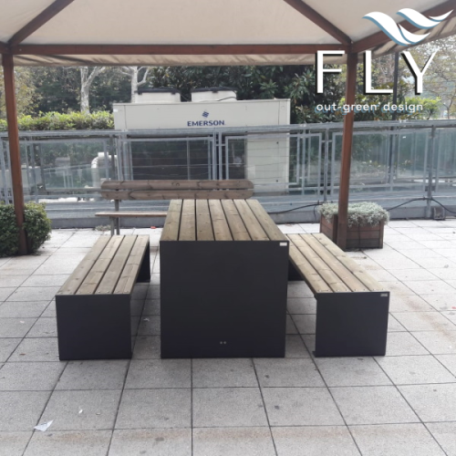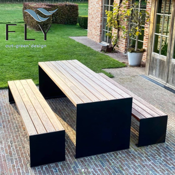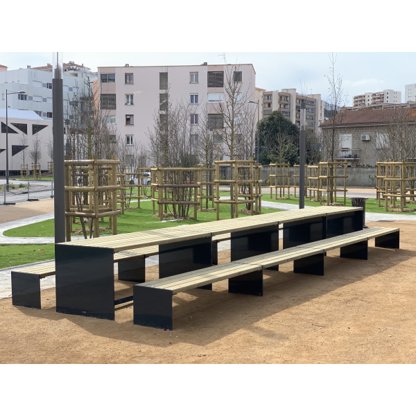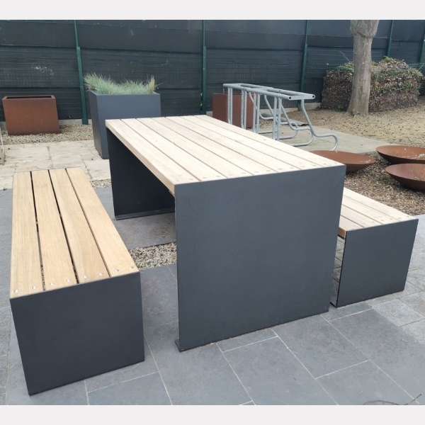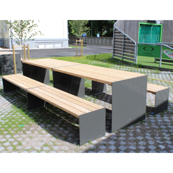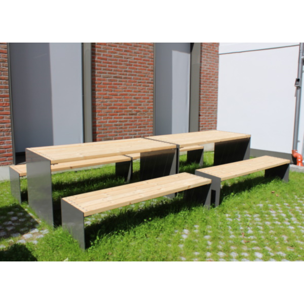 Set s nosivom konstrukcijom od pocinčanog čelika obojanog u raznim RAL bojama. Bočne stranice stola i klupa sastoje se od dva čvrsta bočna ramena od čeličnog lima na koje su zavarene bazne ploče kako bi se konstrukcija mogla pričvrstiti na tlo ekspanzionim vijcima. Ploče na kojima su pričvršćene drvene letvice zavarene su na gornji dio nosača. Sjedala i ploča stola izrađeni su od debelih kvalitetnih drvenih letvica. Kako bi se osigurala stabilnost sjedala, šipka za ojačanje pričvršćena je središnje pomoću vijaka. Vijci su u potpunosti od nehrđajućeg čelika