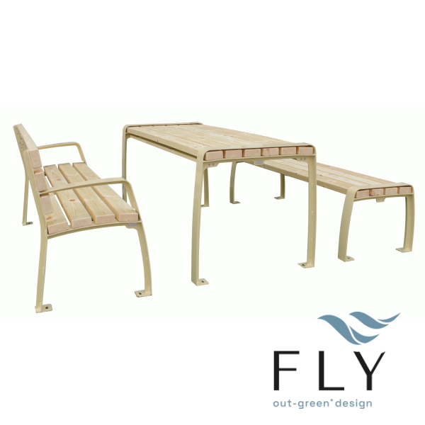 Set Senior s stolom i klupama od finog drveta. Set s nosivom konstrukcijom od pocinčanog čelika i bojan u raznim RAL bojama. Bočne stranice stola i klupa sastoje se od ravnih nosača ojačanih laserski izrezanim profilom na koji su zavarene bazne ploče kako bi se konstrukcija pričvrstila na tlo ekspanzionim vijcima. Ploče na kojima su pričvršćene drvene letvice zavarene su u gornji dio nosača. Sjedalo i ploča stola izrađeni su od kvalitetnih drvenih letvica tretiranih za vanjsku upotrebu. Kako bi se sjedalu osigurala stabilnost, šipka za pojačanje pričvršćena je središnje vijcima. Vijci su u cijelosti izrađeni od nehrđajućeg čelika