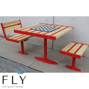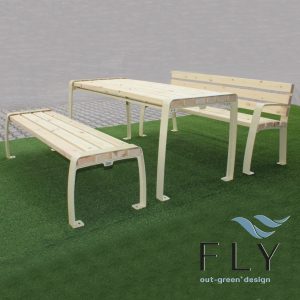 Set Simply s nosivom konstrukcijom od pocinčanog čelika i obojan u raznim RAL bojama. Bočne stranice stola i klupa izrađene su od dva čvrsta bočna ramena u ravnini koja su na odgovarajući način savijena, zavarena i izbušena kako bi se konstrukcija mogla pričvrstiti na tlo ekspanzionim vijcima. U gornjem dijelu nosača nalaze se odgovarajuće rupe za pričvršćivanje drvenih letvica. Sjedala i ploča stola izrađeni su od letvica nordijskog bora impregniranih u autoklavu u skladu sa standardima DIN 68800-3 kako bi se drvo zaštitilo od napada gljivica, plijesni i atmosferskih utjecaja. Vijci su u potpunosti od nehrđajućeg čelika.