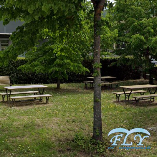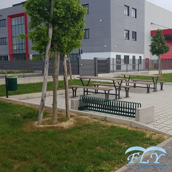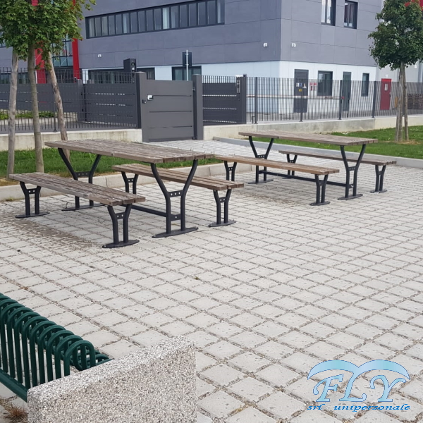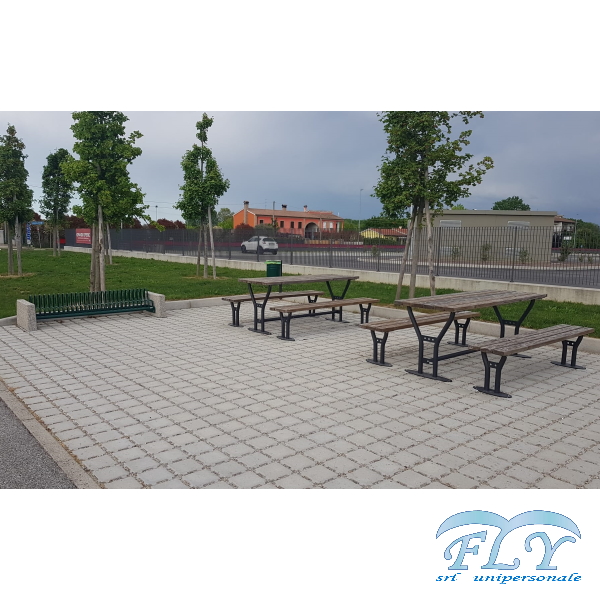 Village garnitura čelik – drvo sastoji se od stola i dvije klupe sa ili bez naslona. Stol se sastoji od pocinčane čelične konstrukcije obojane epoksidnim prahom koju čine dvije oblikovane cjevaste noge koje se oslanjaju na eliptičnu podlogu koja se može pričvrstiti vijcima za tlo i na gornjem dijelu od ploče na kojoj je postavljeno 6 drvenih letvica od nordijskog bora ili fino drvo pričvršćeni su čeličnim vijcima. Sjedala imaju iste karakteristike kao stol s eliptičnom bazom i letvicama od finog drva ili borovine. Ova vrsta seta prikladna je za parkove ili planinske krajolike.