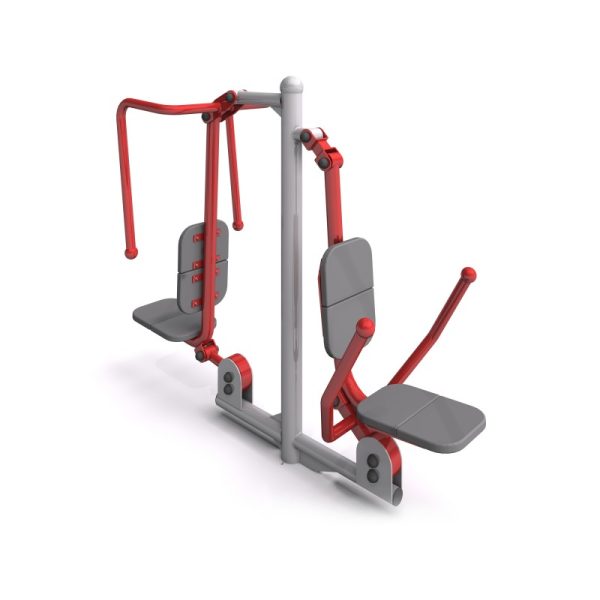 Shoulder Press + Chest Press višenamjenski set za vježbanje na otvorenom za izgradnju snage i izdržljivosti gornjeg dijela tijela. Izgrađuje i oblikuje mišiće prsa, ruku i leđa te poboljšava funkcionalnost kardiopulmonalnog sustava. Ovaj uređaj dostupan je u komfornoj verziji. Poanta ove verzije je pružiti svima optimalnu udobnost za vježbanje. Sjedala su presvučena poliuretanskom pjenom (PU sustav). Kao rezultat toga, korisnici nikada nemaju osjećaj vrućine tijekom vrlo sunčanih dana ili hladnoće tijekom mraza.
