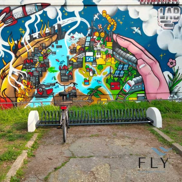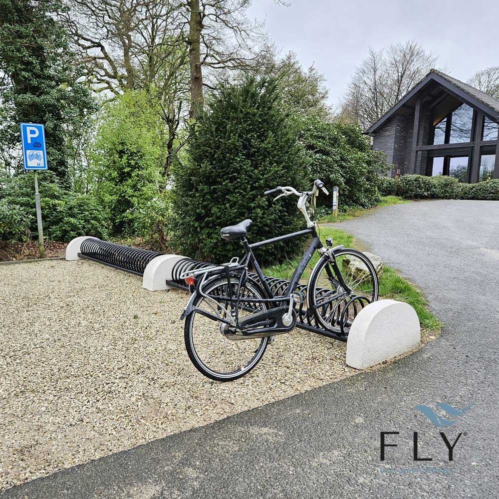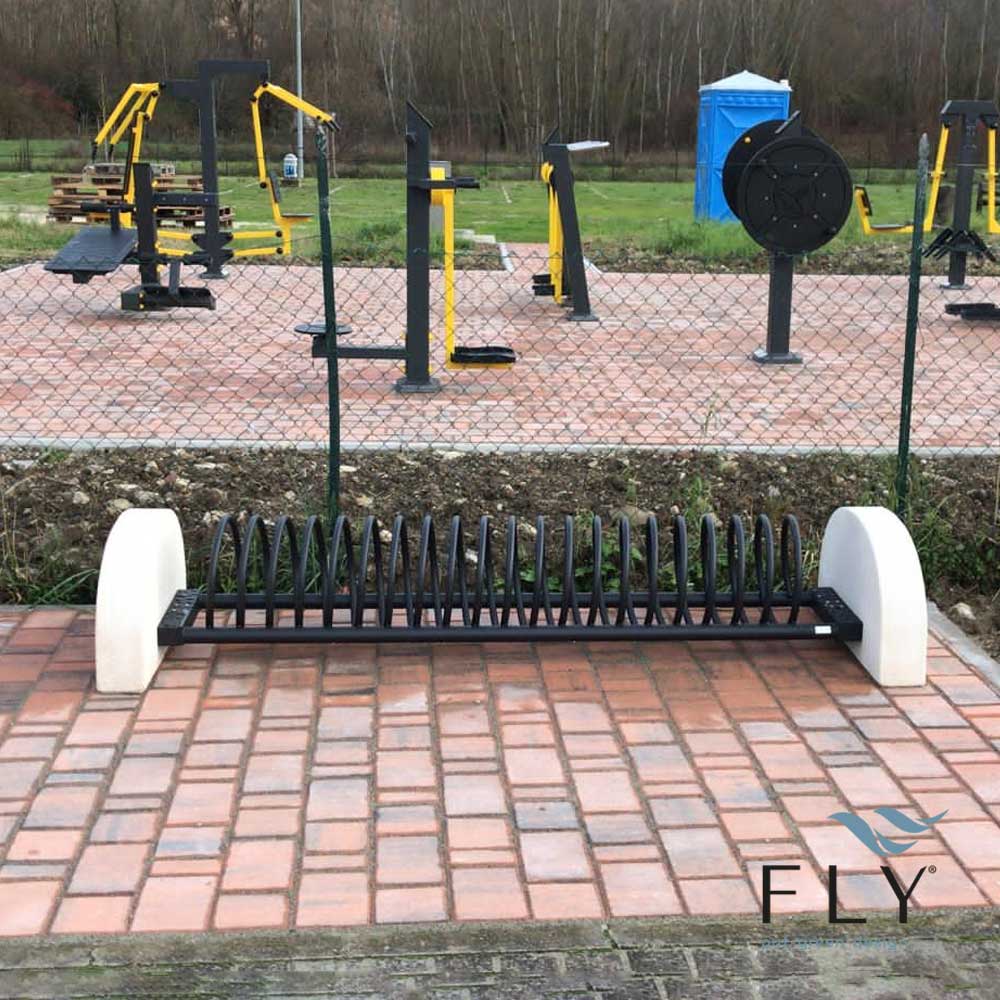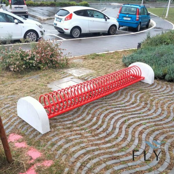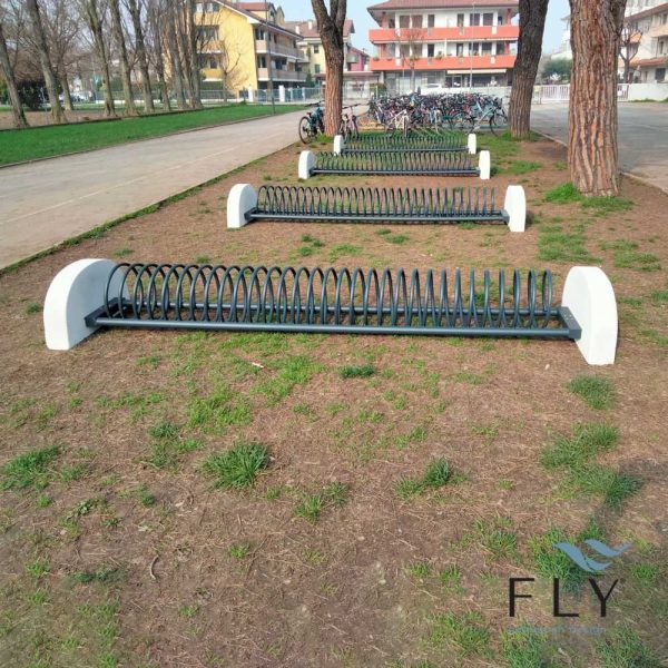 Stalak za bicikle vrlo čvrstog i modernog dizajna prikladan je za škole, oratorije, kolodvore i mjesta velikog bogatstva, a sastoji se od spiralnog elementa izrađenog od cijevi zavarene na dvije vodoravne okrugle čelične cijevi. Na krajevima horizontalnih cijevi zavareni su dupli ravni nosači prikladno izbušeni za pričvršćivanje na bočne betonske nosače. Stranice su zaobljene i izrađene od mramornih krhotina. Svi metalni dijelovi su pocinčani i obojeni termoreaktivnim poliesterskim prahom u raznim RAL bojama.
