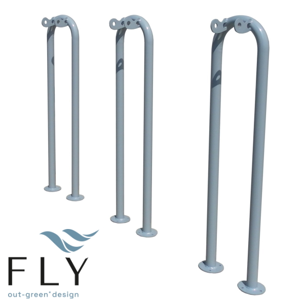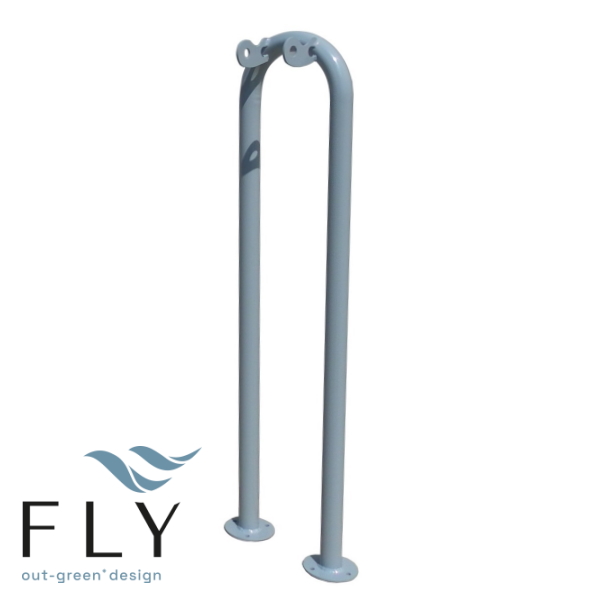 Stalak za skuter Jambo. Nosač za skutere za jednosjed izrađen hladnim savijanjem čeličnih cijevi. Dvije laserski izrezane prirubnice zavarene su na gornji dio kako bi služile kao oslonac za pričvršćivanje upravljača skutera (ili bicikla). Nosač za skuter isporučuje se s osnovnom pločom koja se pričvršćuje vijcima. Izrađena je od pocinčanog čelika i bojana termoreaktivnim poliesterskim prahom u raznim RAL bojama. Može se postavljati zasebno ili na baterije. Osim za skutere, može se koristiti i za bicikle.