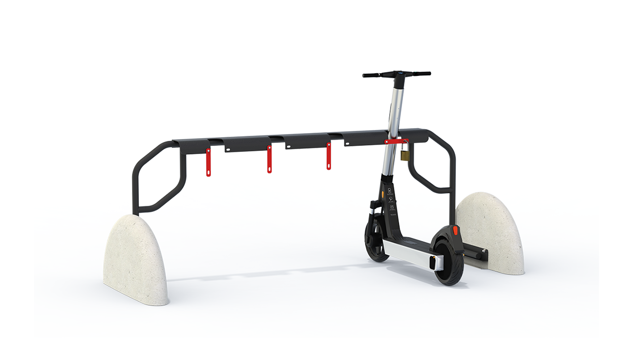Okvir izrađen od pocinčanog čelika sa samonosivim sustavom koji se sastoji od betonskih baza, polukružnog oblika. Metalni nosač koji se sastoji od oblikovanog okvira izrađenog od pocinčanog čeličnog profila s kružnim presjekom. Okvir je zavaren na “L” profile izrađene od pocinčanog lima. Bočni nosači za učvršćivanje, izrađeni od pocinčanog čeličnog profila s kružnim presjekom, odgovarajuće oblikovani i zavareni za okvir. Sustav za pričvršćivanje skutera, koji se sastoji od oblikovanog nosača izrađenog od pocinčanog lima, dobivenog laserskim rezanjem, i opremljen s 4 utora za umetanje lule upravljača. Svaki utor je pak opremljen nosačem za pričvršćivanje vozila pomoću jednostavnog lokota ili kabelske brave.