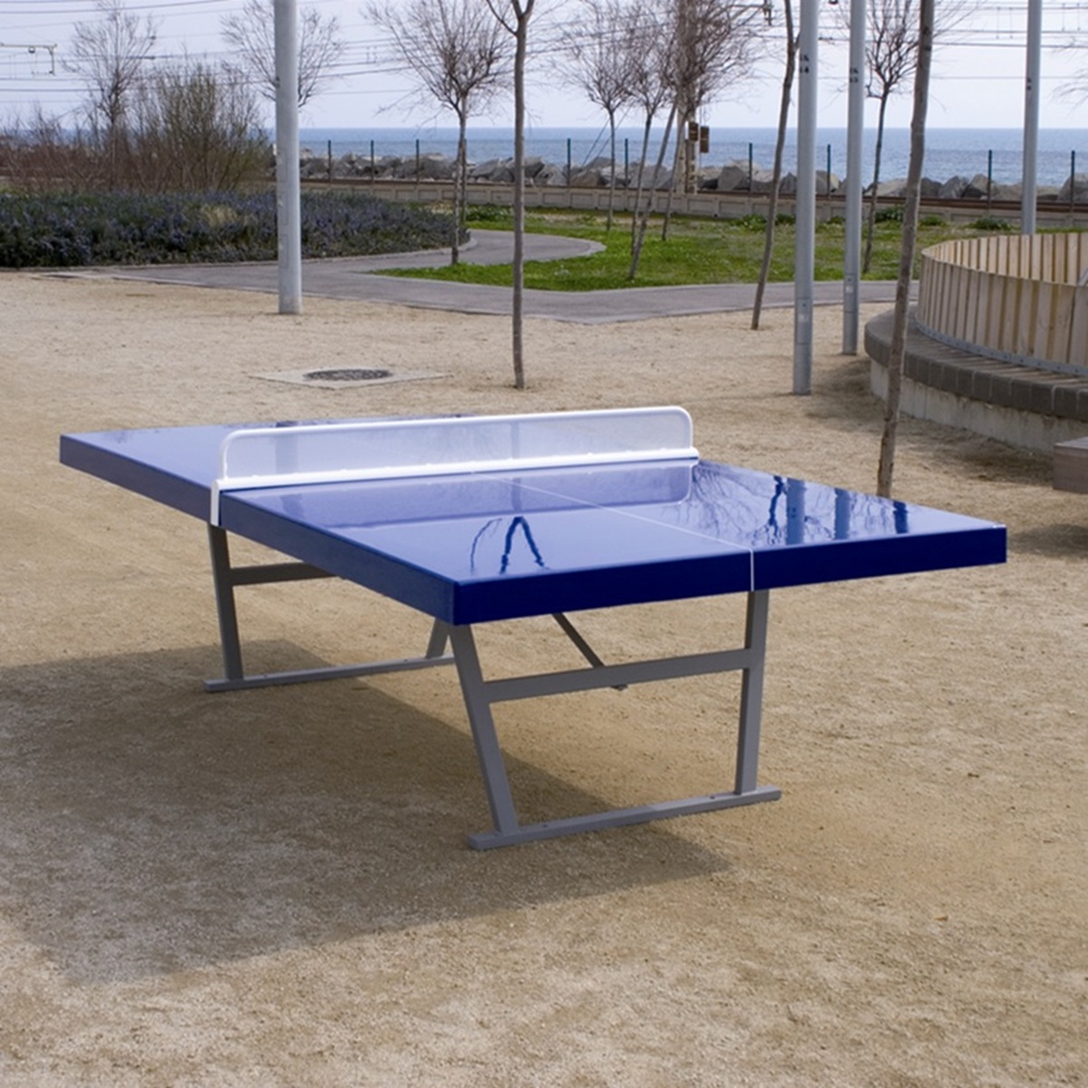 Vanjski stol za stolni tenis Minus, s poliesterskom površinom za igru ​​ojačanom staklenim vlaknima i stvrdnjavajućim smolama. Trapezoidna podloga i cjevasta mreža.