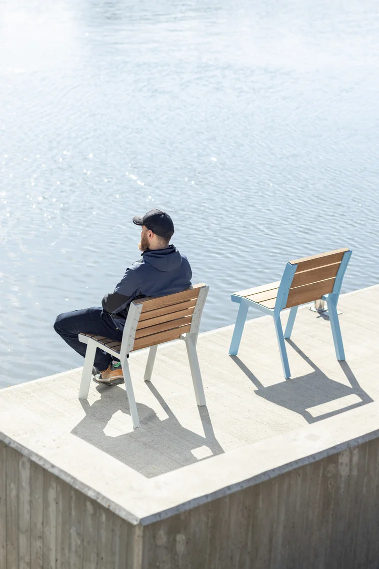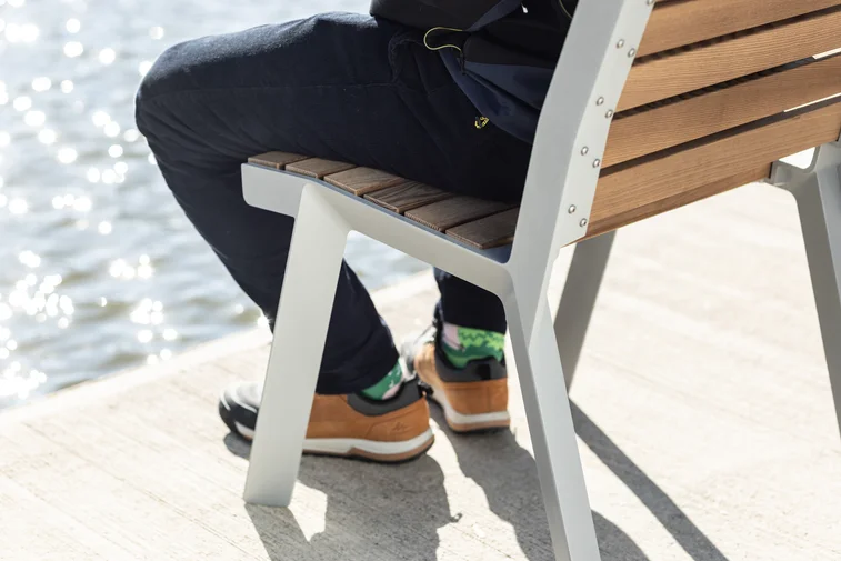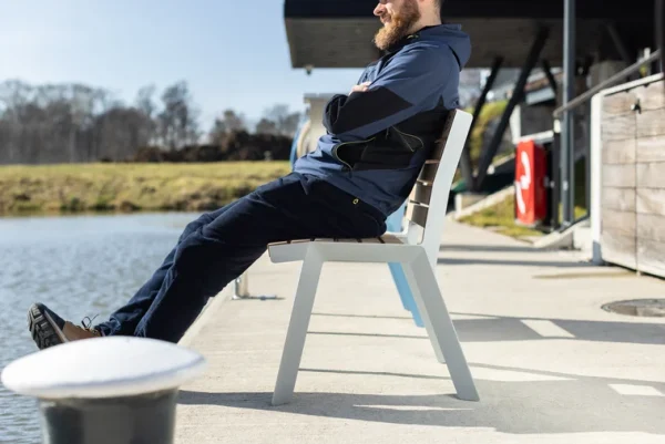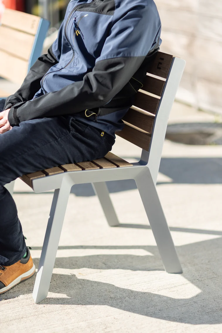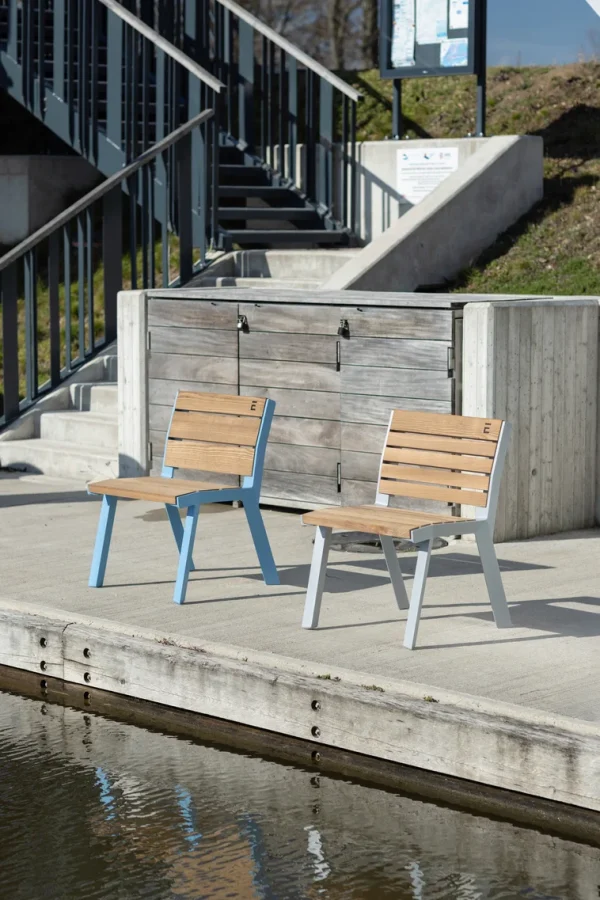 - Materijal: Konstrukcija od aluminijske legure s praškastim premazom, sjedalo i naslon izrađeni od punog drva
