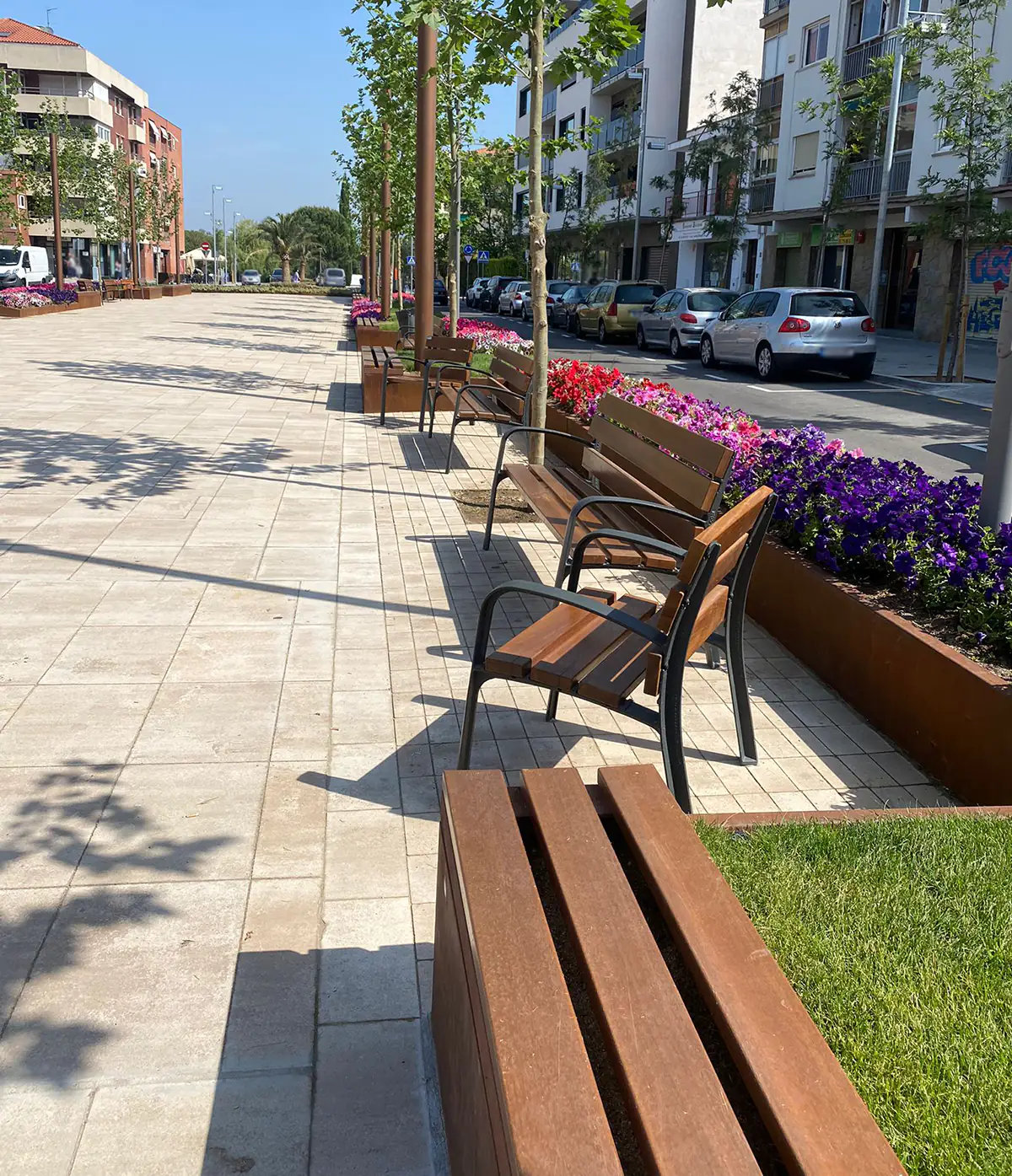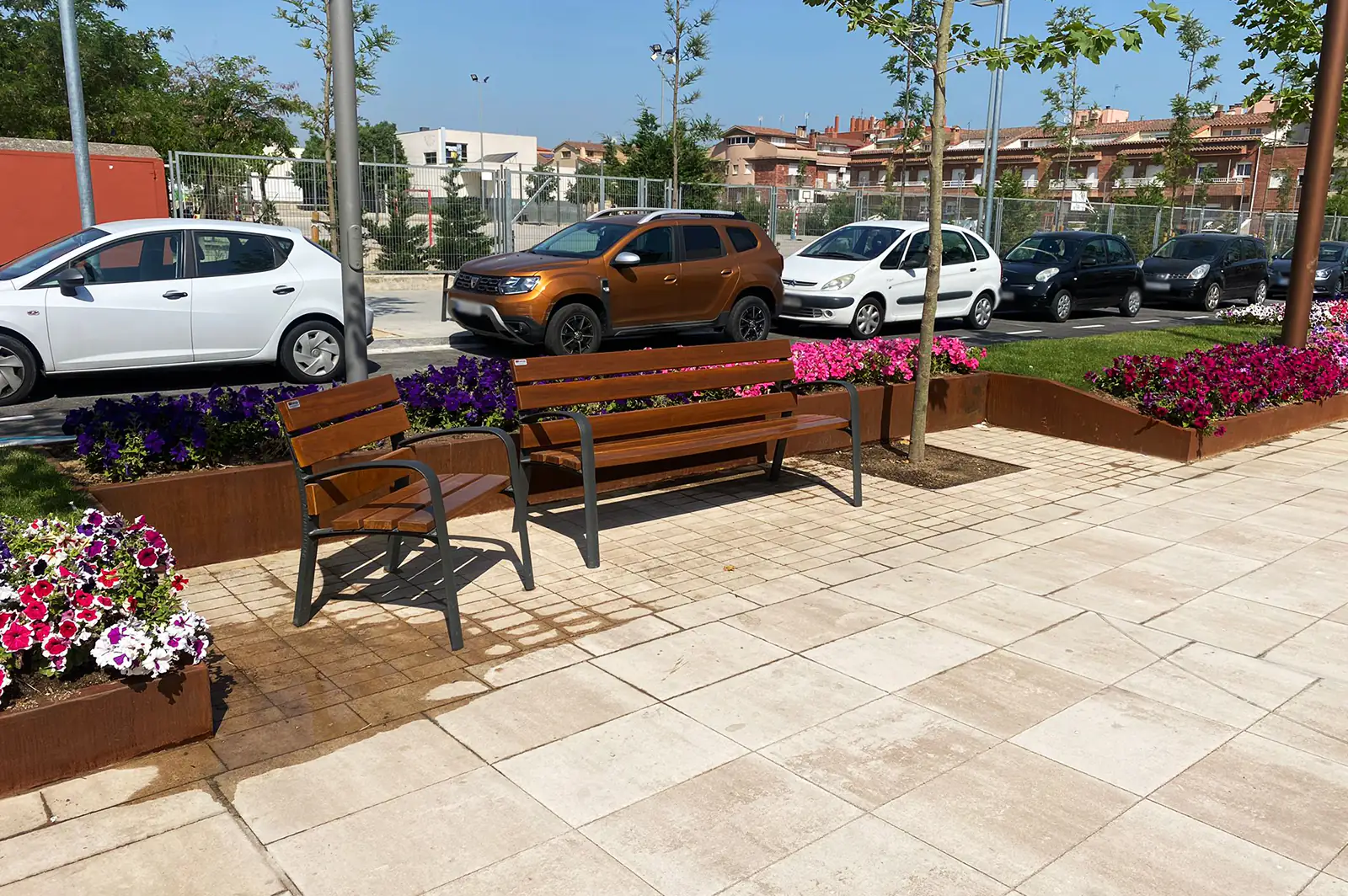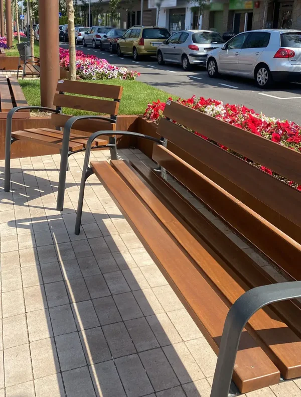 Stolica tipa Modo od nosača od nodularnog lijeva s naslonom za ruke i 6 letvi od drveta iz Gvineje 700x110x35.
