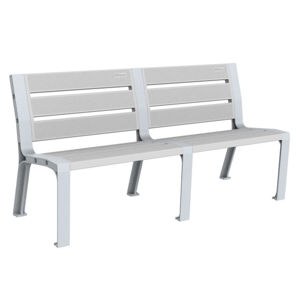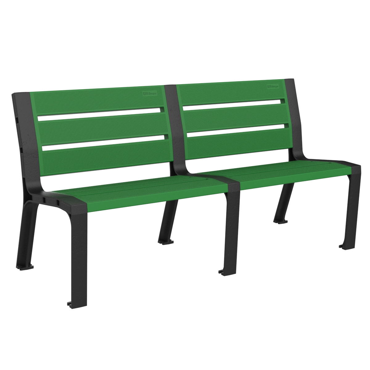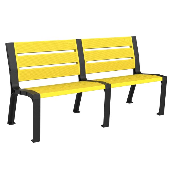 Klupa modela MODO08-PLAST, sa sjedalom i naslonom od polipropilena i nogama od UV tretiranog poliamida, u plavoj boji RAL 5005, dostupna u raznim bojama.