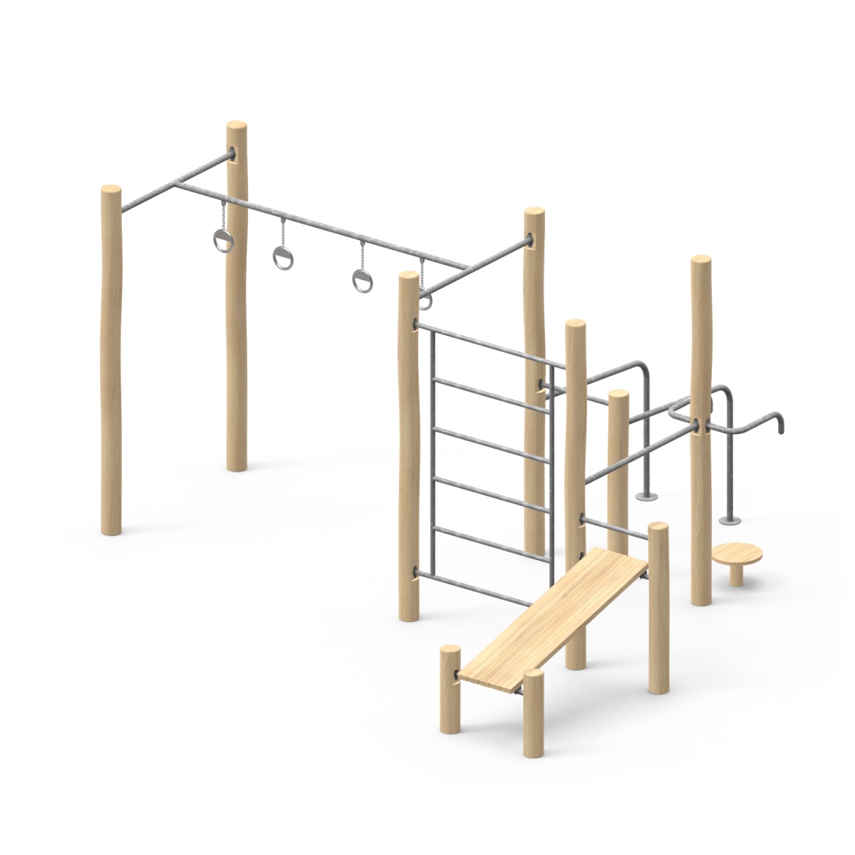 Street Workout 1 s stupovima i konstrukcijom od drva Robinia, pocinčanim čeličnim šipkama s rampom za sklekove, generičke dimenzije: 4750 x 4200 x 2500 mm.