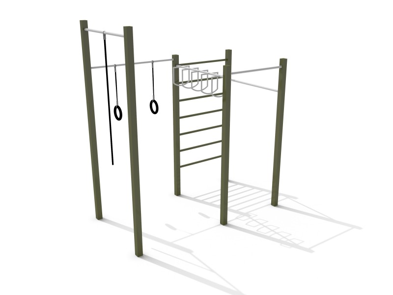Gimnastički set za tinejdžere i odrasle koji se sastoji od: 2 vodoravne šipke, 1 okomite ljestve, 1 vodoravne šipke s ručkama, gimnastičkih karika i 1 užeta za povlačenje. Konstrukcija je izrađena od pocinčanog i plastificiranog čelika. Trening na setu jača mišiće prsa, leđa, ruku, ramena i trbuha. Također utječe na osjećaj ravnoteže i poboljšava motoričku koordinaciju.