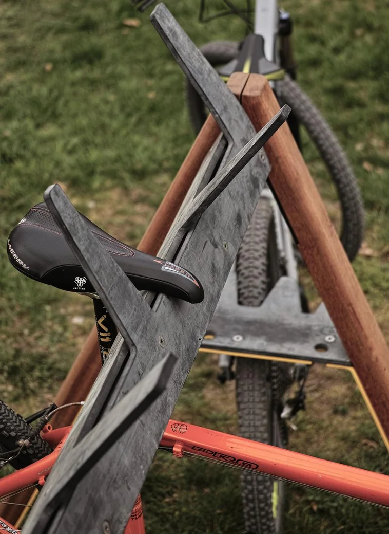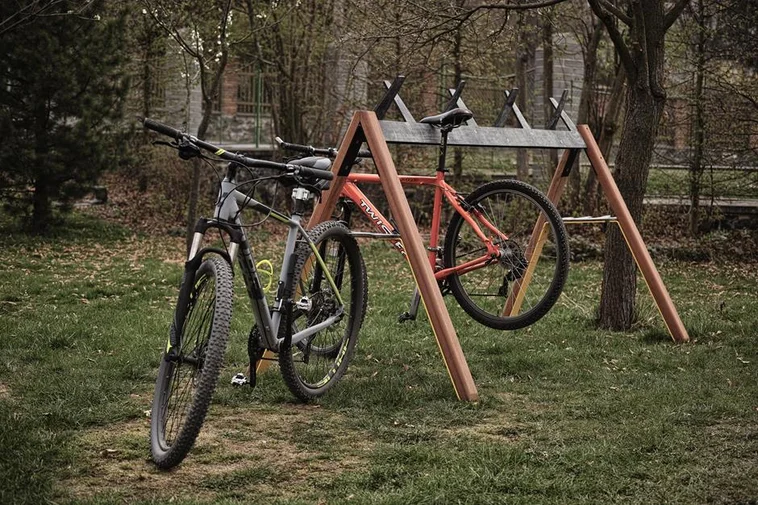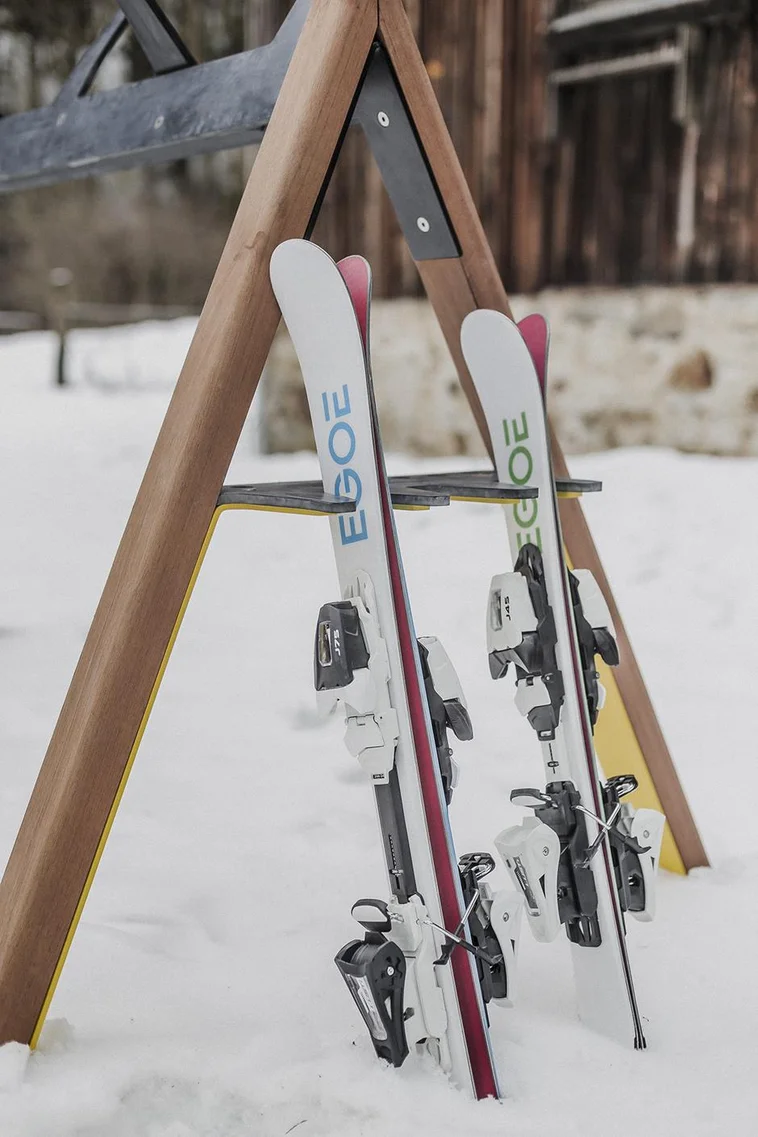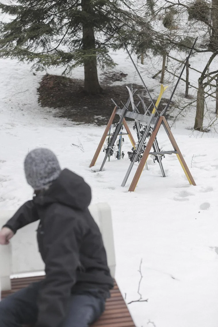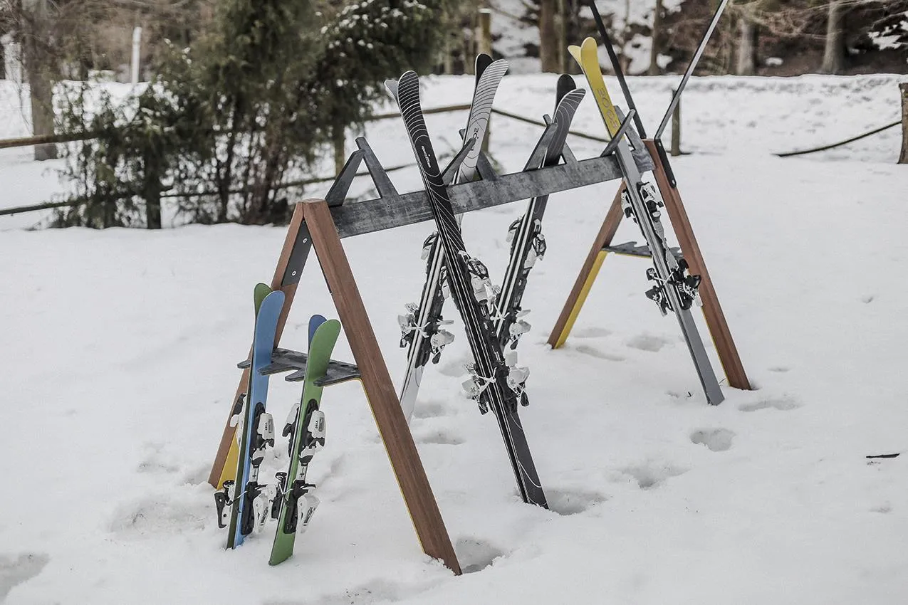 Drvene stijenke u obliku slova A spojene čeličnim ojačanjima s gumenim češljem dobro će poslužiti za dječje skije. Češalj na vrhu ima praktične gumene rogove namijenjene za skije duljine veće od 120 cm. Tijekom biciklističke sezone lako može primiti do 10 bicikala.