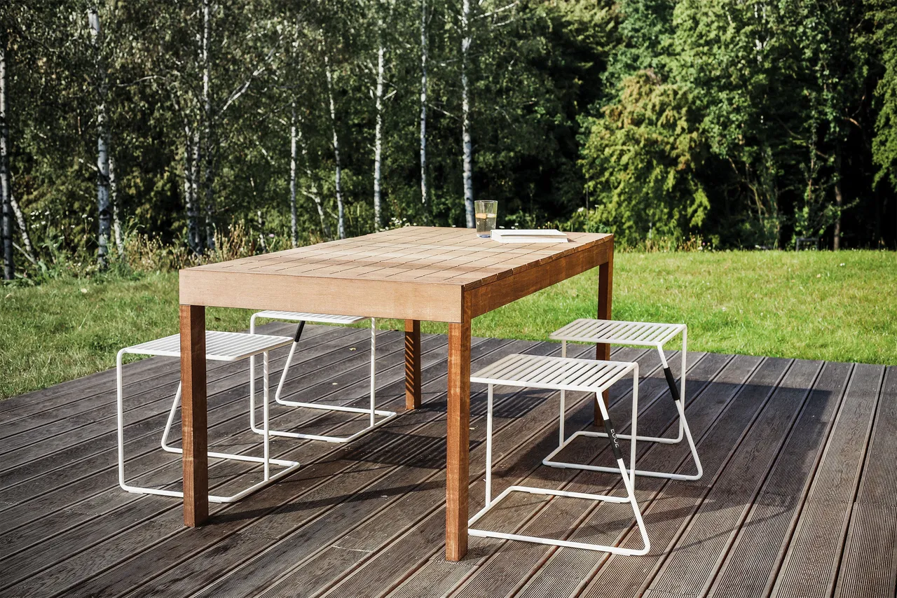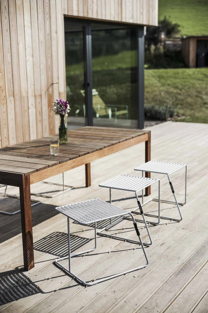 Tražite li još više udobnosti? Ako je tako, možete se odlučiti za verziju s naslonima za ruke i čak dodati tekstilne jastuke za ruke. Okvir je izrađen od čeličnih pocinčanih cijevi s praškastim premazom. Za sjedalo možete birati između tropskog drva, drveta akacije ili čeličnih šipki s mogućnošću dodavanja vanjskog pjenastog tkanja.